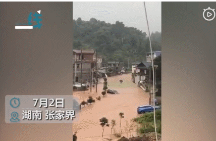 张家界赵家岗新安村暴雨引发山洪灾害,小汽车卷入洪流中,所幸司机得以爬窗逃生。